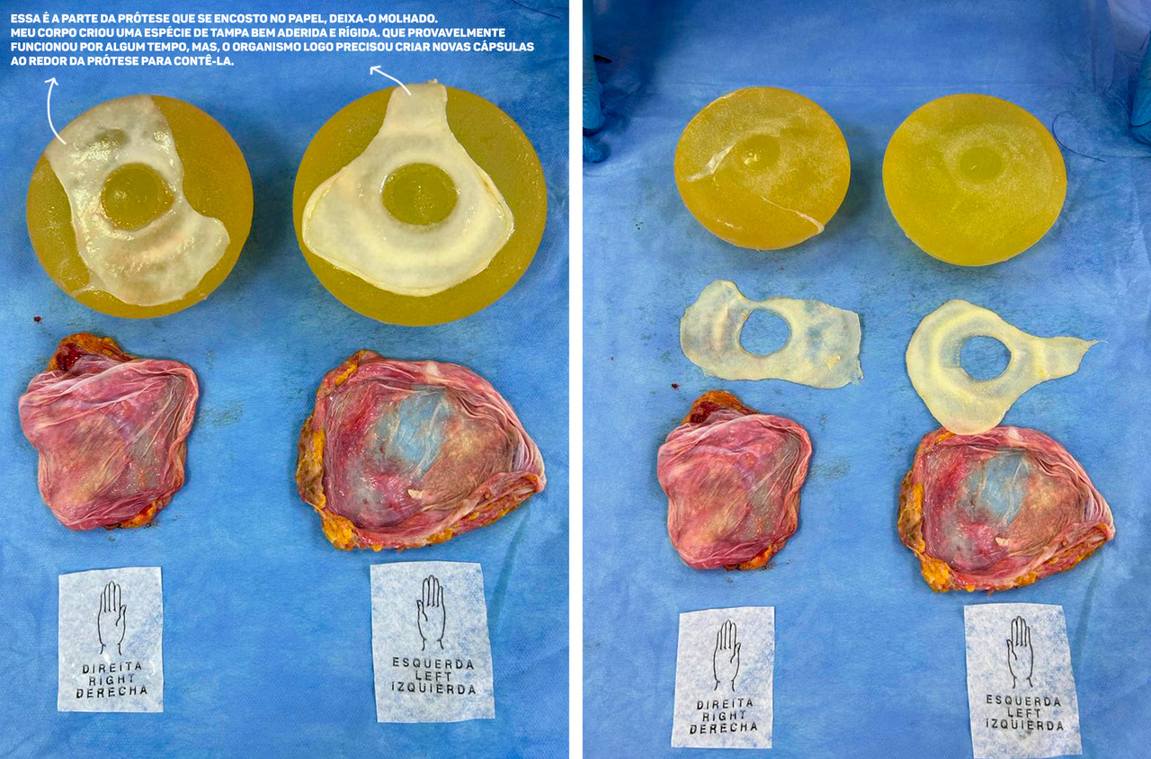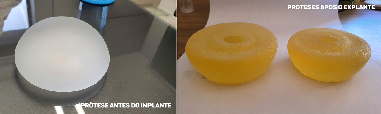 Eu queria ver as próteses, dessa forma, após o procedimento, o médico as limpou e me entregou. Estavam absolutamente diferentes de quando fiz o implante. Elas era brancas inicialmente e não era possível ver o conteúdo delas. Agora apresentam coloração amarela escura e é possível ver algo em seu interior ao manuseá-las.